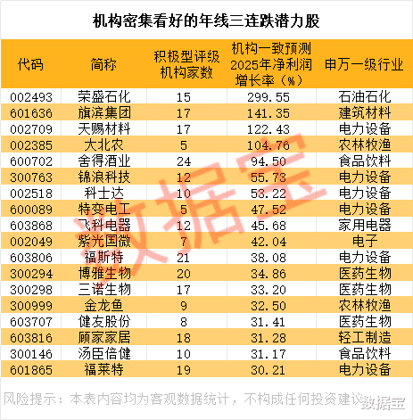 截至6月24日,证券时报•数据宝统计,在2023~2025年股价年线三连跌的A股公司中,按以下条件进行统计:包括2024年归母净利润超3亿元、今年一季度归母净利超0.3亿元、获机构积极型评级(含“买入”和“增持”)家数在5家及以上且机构一致预测今年净利润增速超30%,18只个浮出水面。